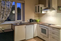 - Virtuves aprīkojums: plīts virsma, cepeškrāsns, ledusskapis, elektriskā tējkanna, tosteris