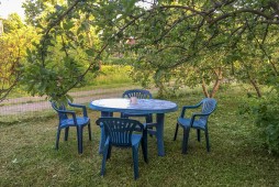- Atpūtas zona un sauļošanās zona dārzā zem ābelēm